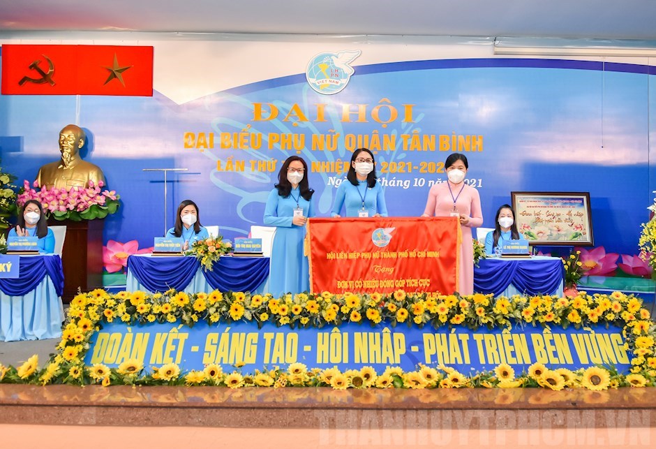 Chủ tịch Hội LHPN Thành phố Nguyễn Trần Phượng Trân tặng Cờ thi đua “Đơn vị có nhiều đóng góp tích cực trong phong trào Phụ nữ và hoạt động Hội nhiệm kỳ 2016 - 2021”(Thanhuytphcm.vn) - Ngày 26/10, Ban Chấp hành Hội Liên hiệp Phụ nữ (LHPN) quận Tân Bình khóa XI (2016-2021) tổ chức Đại hội đại biểu Phụ nữ quận lần thứ XII, nhiệm kỳ 2021 - 2026. Đến dự có các đồng chí: Nguyễn Trần Phượng Trân, Ủy viên Đoàn Chủ tịch Trung ương Hội Liên hiệp Phụ nữ (LHPN) Việt Nam, Thành ủy viên, Chủ tịch Hội LHPN Thành phố; Lê Hoàng Hà, Bí thư Quận ủy; Nguyễn Hoàng Long, Phó Bí thư Thường trực Quận ủy; Trần Đức Phương, Chủ tịch Ủy ban MTTQ Việt Nam quận; Lê Thị Thu Sương, Phó Chủ tịch UBND quận.