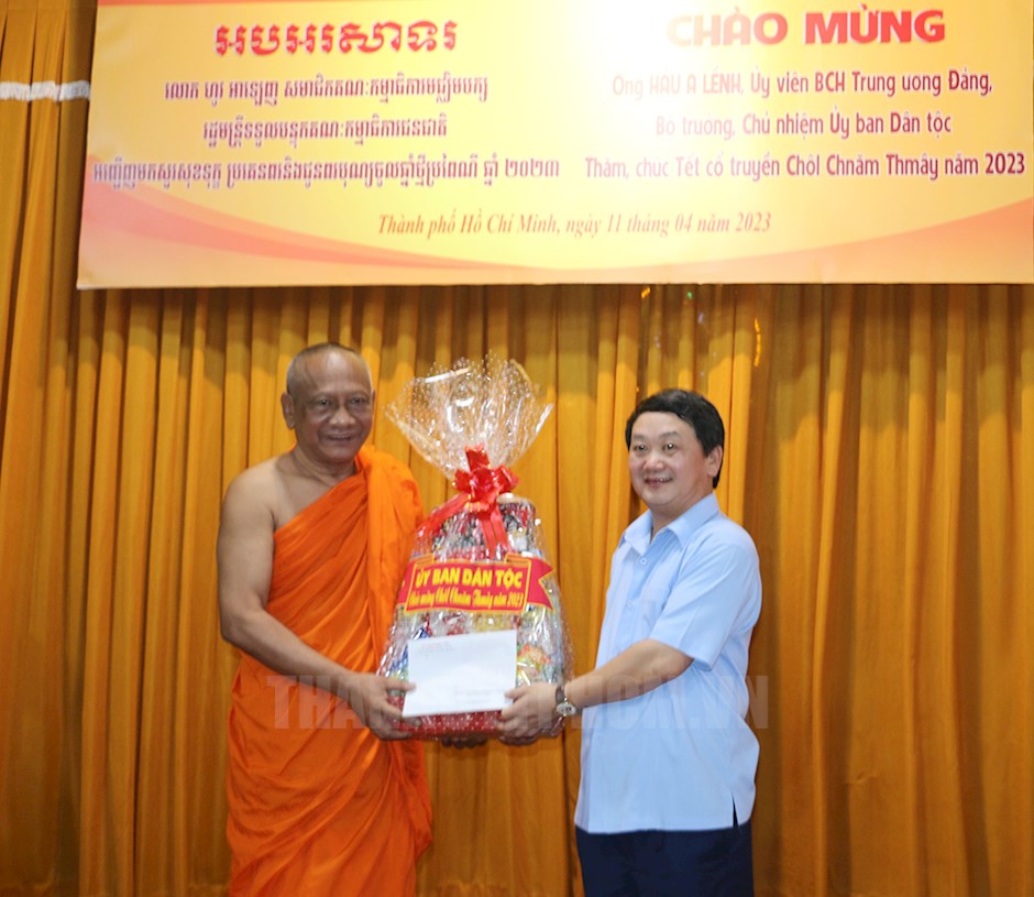 Đồng chí Hầu A Lềnh tặng quà chúc mừng Tết Chôl Chnăm Thmây chùa Candaransi(Thanhuytphcm.vn) - Nhân dịp Tết cổ truyền Chôl Chnăm Thmây của đồng bào Khmer, sáng 11/4, đoàn công tác của Ủy ban Dân tộc do đồng chí Hầu A Lềnh, Ủy viên Trung ương Đảng, Bộ trưởng, Chủ nhiệm Ủy ban Dân tộc làm trưởng đoàn, đã đến thăm, tặng quà chúc Tết các chư tăng, Phật tử Nam tông, đại diện đồng bào Khmer đang sinh sống, làm việc và học tập tại TPHCM. Tham gia đoàn, lãnh đạo TPHCM có đồng chí Ngô Minh Châu, Thành ủy viên, Phó Chủ tịch UBND TP.