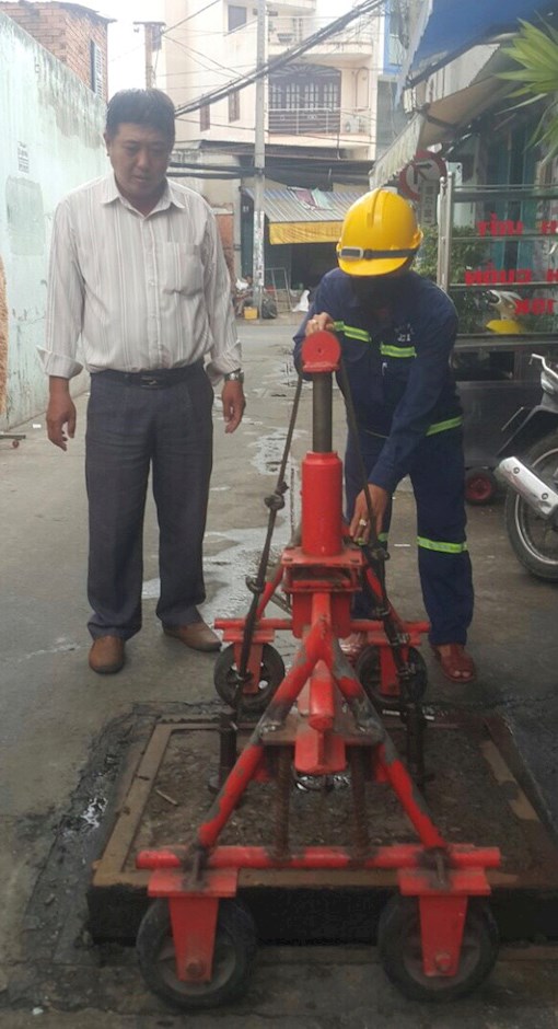 Công nhân đang vận hành giàn xe cải tiến chở bùn và máy hút bùn, một sáng kiến của anh Huỳnh Ngọc ThanhNăm 2017, anh tiếp tục thực hiện sáng kiến “Giàn nâng thủy lực mở nắp hầm ga”. Để thực hiện công tác duy tu nạo vét bùn hầm ga cống thoát nước thì công việc đầu tiên là phải mở nắp đan hầm ga sau đó người công nhân mới chui xuống hầm ga nạo vét bùn được. Tuy nhiên, trong quá trình thực hiện có một số nắp hầm ga bị rỉ sét dính rất chặt, rất khó mở, gây tốn rất nhiều thời gian và công sức. Thậm chí có khi phải đập bể nắp đan thay vào cái mới. Xuất phát từ thực tế trên, anh nghiên cứu thiết kế, chế tạo thành công giàn nâng bằng thủy lực của con đội xe tải. Kết quả rất hiệu quả không còn tốn nhiều thời gian và công sức cũng như không còn phải đập bỏ đan để xuống hầm ga nạo vét bùn cống.