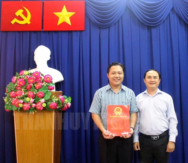 Đồng chí Lê Hoàng Hà, Phó Bí thư Quận ủy, Chủ tịch UBND quận Gò Vấp (bìa phải) trao quyết định cho đồng chí Nguyễn Lê Trung