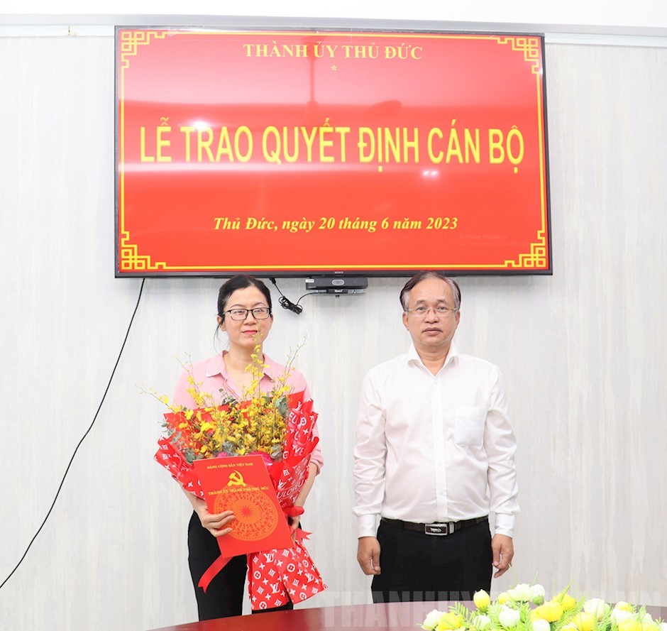 Đồng chí Nguyễn Phước Hưng, Phó Bí thư Thường trực Thành ủy, Chủ tịch HĐND TP Thủ Đức trao quyết định và tặng hoa chúc mừng đồng chí Nguyễn Thị Hồng Nhung(Thanhuytphcm.vn) - Sáng 20/6, Thành ủy Thủ Đức tổ chức lễ trao Quyết định công tác cán bộ. Tham dự buổi lễ có các đồng chí: Nguyễn Phước Hưng, Ủy viên Ban Chấp hành Đảng bộ TPHCM, Phó Bí thư Thường trực Thành ủy, Chủ tịch HĐND TP Thủ Đức; Đặng Thị Bích Thuận, Thành ủy viên, Phó Trưởng Ban Tổ chức Thành ủy Thủ Đức cùng các đồng chí Ủy viên Ban Chấp hành Đảng bộ phường Phước Bình (TP Thủ Đức).