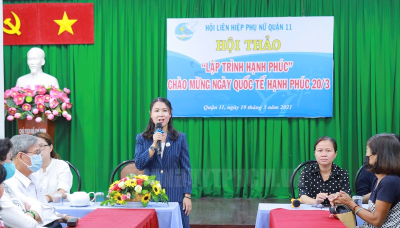 Báo cáo viên Nguyễn Thị Mai Trang giao lưu với các hội viên, thành viên CLB xây dựng Gia đình hạnh phúc tại hội thảo.(Thanhuytphcm.vn) – Sáng 19/3, Hội Liên hiệp Phụ nữ Quận 11 đã tổ chức Hội thảo chủ đề “Lập trình hạnh phúc” nhân kỷ niệm ngày Quốc tế hạnh phúc 20/3 đồng thời lồng ghép các nội dung tuyên truyền về Đề án 938 năm 2021 cho hơn 150 hội viên, phụ nữ, thành viên CLB xây dựng gia đình hạnh phúc, nam nữ thanh niên. Tham dự và đồng thời là báo cáo viên của hội nghị có đồng chí Nguyễn Thị Mai Trang, Ủy viên Thường vụ, Trưởng Ban Dân vận Quận ủy Quận 11.
