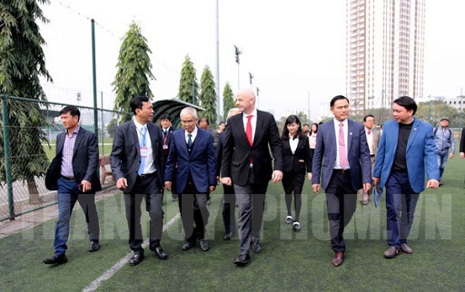 Chủ tịch FIFA (giữa) trong một chuyến sang thăm và làm việc cùng LĐBĐ Việt Nam(Thanhuytphcm.vn) - Liên đoàn bóng đá thế giới (FIFA) đang xúc tiến giải ngân gói gỗ trợ 150 triệu USD để giúp các Liên đoàn bóng đá thành viên đang gặp khó khăn trong mùa dịch Covid-19.