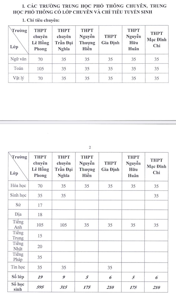 Năm học 2021 – 2022, Trường THPT Nguyễn Thượng Hiền tuyển 5 lớp chuyên với 175 chỉ tiêu; Trường THPT Gia Định tuyển 6 lớp chuyên với 210 chỉ tiêu; Trường THPT Nguyễn Hữu Huân tuyển 5 lớp chuyên với 175 chỉ tiêu và THPT Mạc Đỉnh Chi tuyển 6 lớp chuyên với 210 chỉ tiêu.