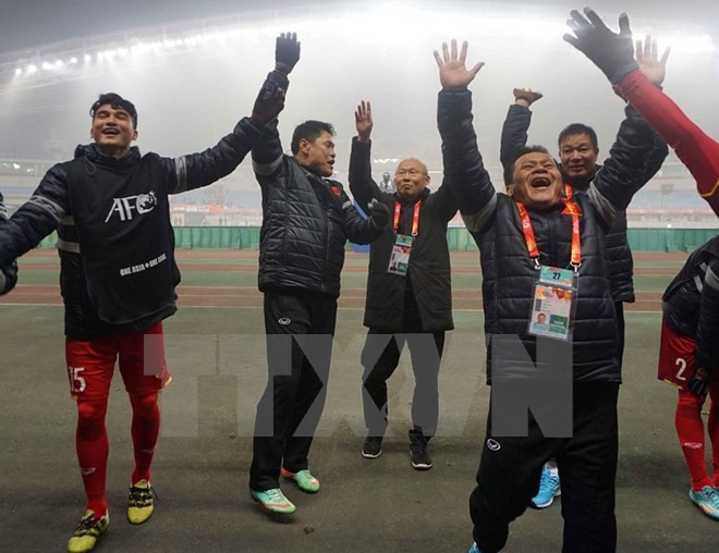 Niềm vui của ban huấn luyện và các cầu thủ đội U23 Việt Nam sau khi đánh bại U23 Iraq. (Nguồn: TTXVN)