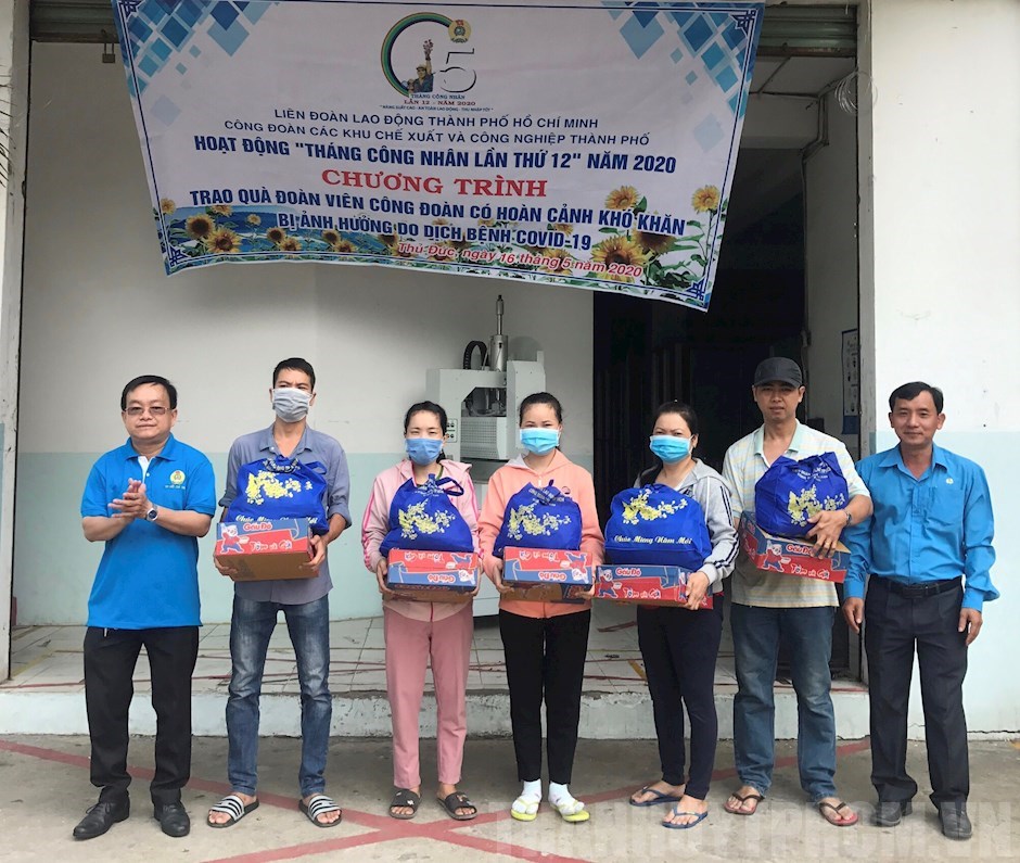 Chủ tịch Công đoàn các Khu chế xuất và Công nghiệp TPHCM Huỳnh Văn Tuấn trao quà hỗ trợ công nhân mất việcTrước đó, chiều 15/5, Công đoàn các Khu chế xuất và Công nghiệp TPHCM đã tặng quà cho 81 nữ công nhân Công ty TNHH Yesum Vina đang mang thai, nuôi con nhỏ dưới 12 tháng tuổi. Mỗi phần quà trị giá 1,2 triệu đồng, trong đó, Liên đoàn Lao động TP hỗ trợ 1 triệu đồng; Công đoàn các Khu chế xuất và Công nghiệp TPHCM hỗ trợ quà trị giá 200.000 đồng.
