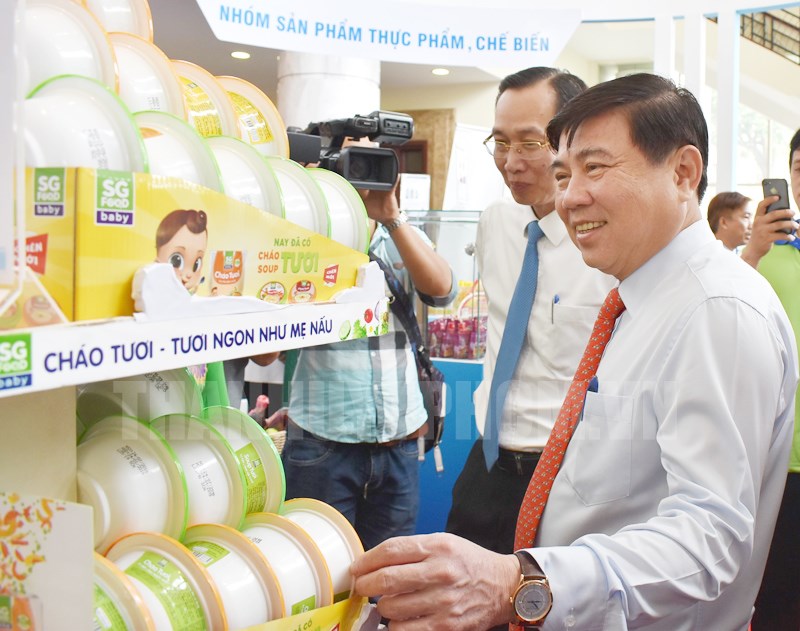 Chủ tịch UBND TPHCM Nguyễn Thành Phong tham quan sản phẩm thực phẩm chế biến tại triển lãm trưng bày nhóm sản phẩm công nghiệp chủ lực của TPHCM.(Thanhuytphcm.vn) - UBND TPHCM vừa ban hành quyết định Chương trình hỗ trợ phát triển doanh nghiệp (DN) và sản phẩm ngành chế biến lương thực - thực phẩm TP giai đoạn 2020 - 2030.