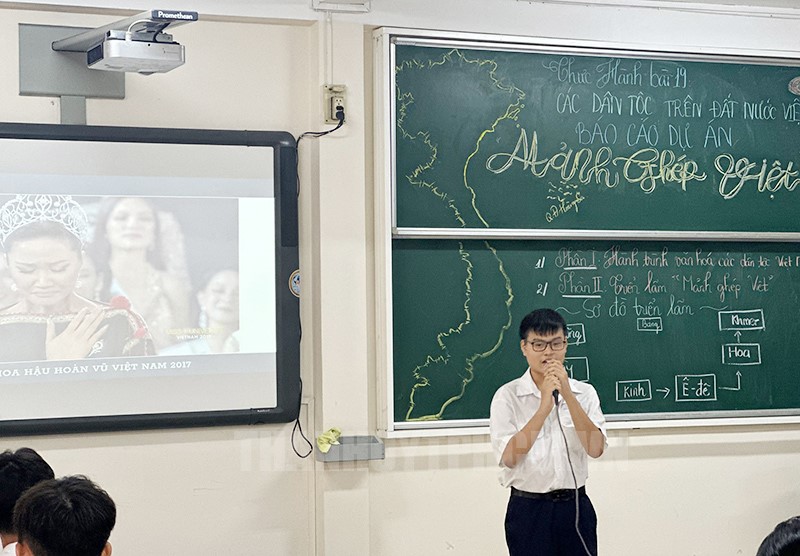 Học sinh thuyết trình về đặc trưng văn hóa của dân tộc Ê-đê(Thanhuytphcm.vn) - Nằm trong chương trình giáo dục phổ thông 2018, ngày 4/4, tại Trường THPT Nguyễn Thái Bình (quận Tân Bình), trong tiết học môn Lịch sử, học sinh khối lớp 10 được tìm hiểu về các dân tộc trên đất nước Việt Nam qua dự án “Mảnh ghép Việt”.