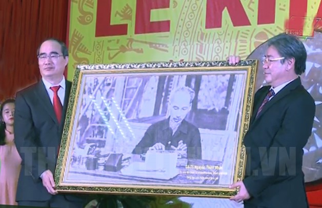 Bí thư Thành ủy TPHCM Nguyễn Thiện Nhân tặng quà lưu niệm cho Học viện Hành chính Quốc gia - Cơ sở TPHCM. (Ảnh: Hoàng Thùy)