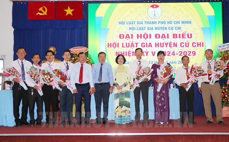 Phó Chủ tịch Hội Luật gia TPHCM Ung Thị Xuân Hương và Phó Bí thư Thường trực Huyện ủy Lê Thanh Phong (thứ 6 từ trái sang) tặng hoa chúc mừng Ban Chấp hành Hội Luật gia huyện Củ Chi, nhiệm kỳ 2024 - 2029.(Thanhuytphcm.vn) - Ngày 13/4, Hội Luật gia huyện Củ Chi tổ chức Đại hội đại biểu, nhiệm kỳ 2024 - 2029. Đến dự có các đồng chí: Ung Thị Xuân Hương, Phó Chủ tịch Hội Luật gia TPHCM; Lê Thanh Phong, Phó Bí thư Thường trực Huyện ủy; Lê Đình Đức, Huyện ủy viên, Phó Chủ tịch UBND huyện Củ Chi…