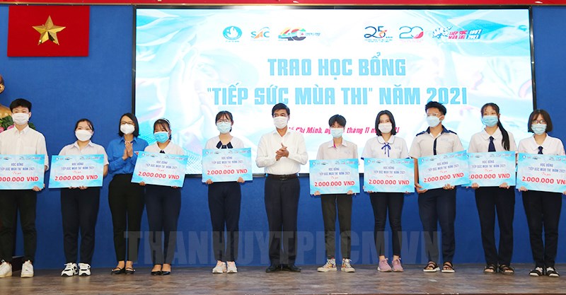 Ban tổ chức trao học bổng “Tiếp sức mùa thi” năm 2021 cho thí sinh có hoàn cảnh khó khăn.(Thanhuytphcm.vn) - Sáng 11/11, Hội Sinh viên Việt Nam TPHCM, Trung tâm Hỗ trợ học sinh, sinh viên TPHCM phối hợp với Tập đoàn Thiên Long tổ chức chương trình Lễ kỷ niệm 25 năm Chương trình Hỗ trợ thí sinh thi đại học, cao đẳng (ĐH-CĐ), 20 năm Chương trình Tiếp sức mùa thi nhân rộng toàn quốc và lễ tổng kết Chương trình Tiếp sức mùa thi năm 2021.