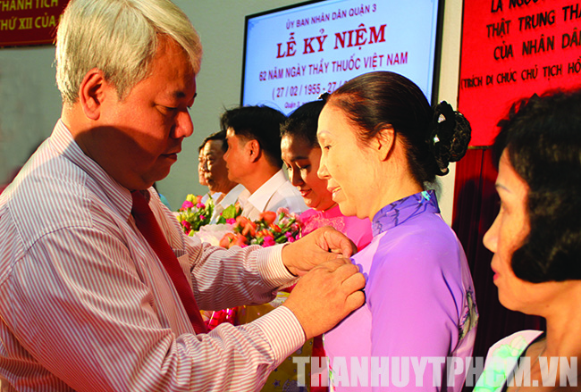 Đồng chí Võ Khắc Thái, Phó Bí thư Quận ủy, Chủ tịch Ủy ban Nhân dân Quận 3 trao kỷ niệm chương “Vì sức khỏe nhân dân” cho các cá nhân tiêu biểu vì sự nghiệp chăm sóc và bảo vệ sức khỏe nhân dân.
