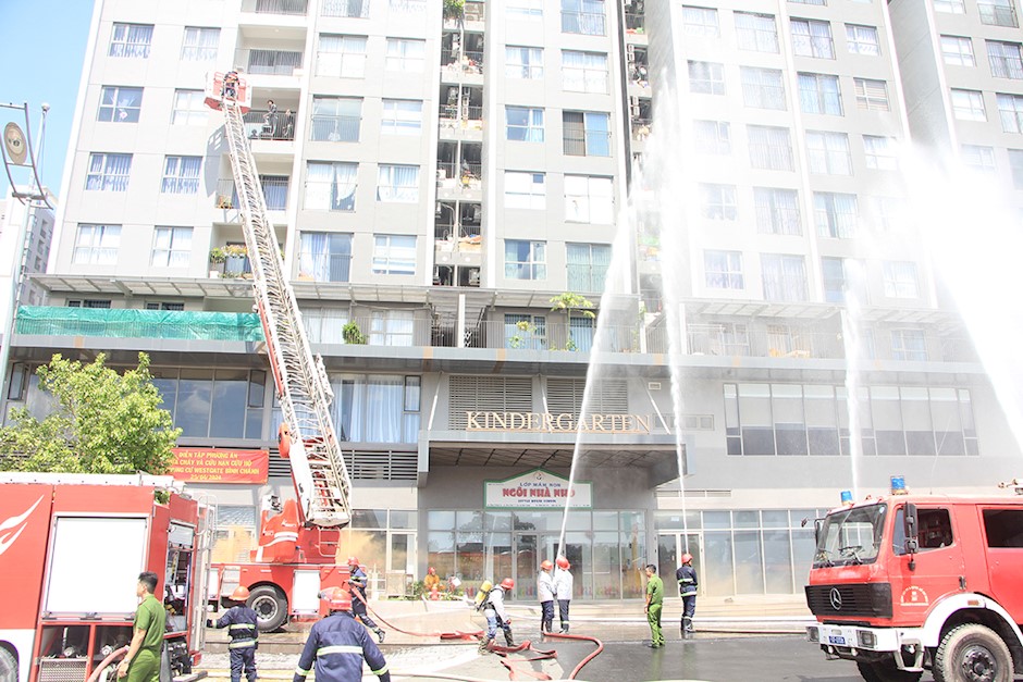 Tình huống giả định: Vào lúc 11 giờ 00 phút, ngày 25/4/2024, xảy ra sự cố cháy tại căn hộ tầng 6, Block A2, khu A - Khu Trung tâm Thương mại dịch vụ và nhà ở, do chập điện sinh hoạt gây ra cháy, đám cháy lan sang các căn hộ liền kề gây ra đám cháy lớn, tại thời điểm xảy ra sự cố cháy; có 100 người trong văn phòng, căn hộ và xung quanh Trung tâm đang tìm cách thoát ra khu vực an toàn. Ước tính diện tích đám cháy khoảng 50m2, làm 5 người bị nạn đang mắc kẹt trong đám cháy.