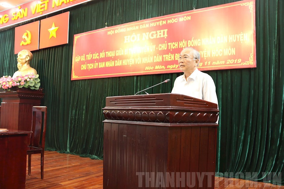 Bí thư Huyện ủy, Chủ tịch HĐND huyện Nguyễn Cư phát biểu chỉ đạo tại Hội nghị(Thanhuytphcm.vn) - Chiều 8/11, huyện Hóc Môn tổ chức hội nghị gặp gỡ, tiếp xúc, đối thoại giữa lãnh đạo huyện Hóc Môn với người dân trên địa bàn huyện. Tham dự có các đồng chí: Nguyễn Cư, Bí thư Huyện ủy, Chủ tịch HĐND huyện; Dương Hồng Thắng, Phó Bí thư Huyện ủy, Chủ tịch UBND huyện Hóc Môn.