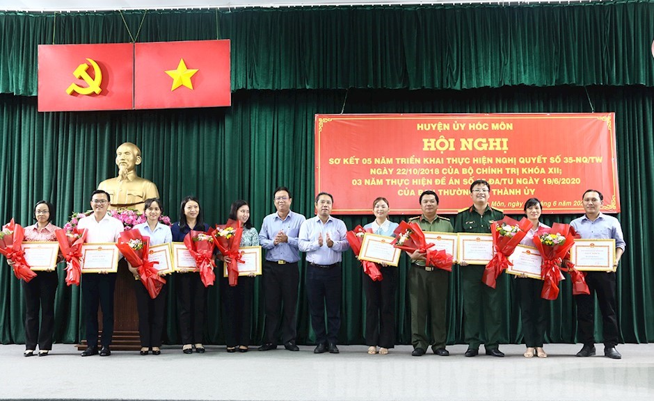 Dịp này, UBND huyện Hóc Môn tặng Giấy khen cho 19 tập thể và 17 cá nhân có thành tích xuất sắc trong 5 năm triển khai thực hiện Nghị quyết số 35-NQ/TW và 3 năm thực hiện Đề án số 05-ĐA/TU.Chú thích ảnh: