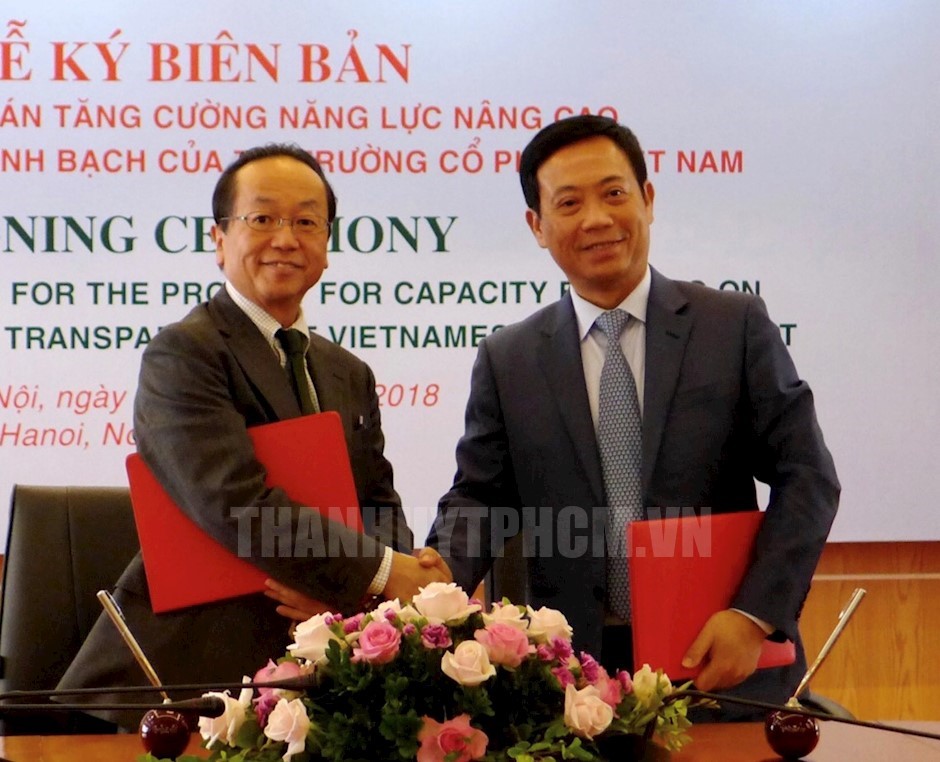 Trưởng Đại diện JICA Việt Nam Konaka Tetsuo và Chủ tịch Uỷ ban Chứng khoán nhà nước Trần Văn Dũng thực hiện nghi thức ký kết(Thanhuytphcm.vn) – Ngày 5/11, Cơ quan hợp tác quốc tế Nhật Bản tại Việt Nam (JICA) phối hợp Uỷ ban Chứng khoán nhà nước (UBCKNN) tổ chức lễ ký kết biên bản triển khai dự án “Tăng cường năng lực về nâng cao tính công bằng và minh bạch của thị trường cổ phiếu Việt Nam” (dự án).