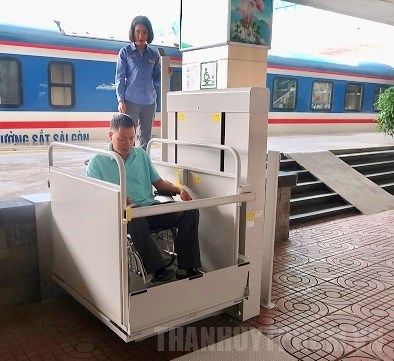Chạy thử xe nâng với tải trọng của xe lăn và người khuyết tật ở khu vực sân ga số 1, Ga Hà Nội(Thanhuytphcm.vn) – Chiều 28/11, Văn phòng Cơ quan hợp tác quốc tế Nhật Bản tại Việt Nam (JICA) cho biết: Công ty TNHH Syntex (tỉnh Tochigi – Nhật Bản) vừa phối hợp Tổng Công ty Đường sắt Việt Nam và Bệnh viện Chỉnh hình và Phục hồi chức năng Hà Nội lắp đặt giới thiệu, trình diễn thiết bị ghế cầu thang và xe nâng dành cho người già và người khuyết tật. Thời gian thực hiện từ nay đến giữa tháng 3 năm 2020.