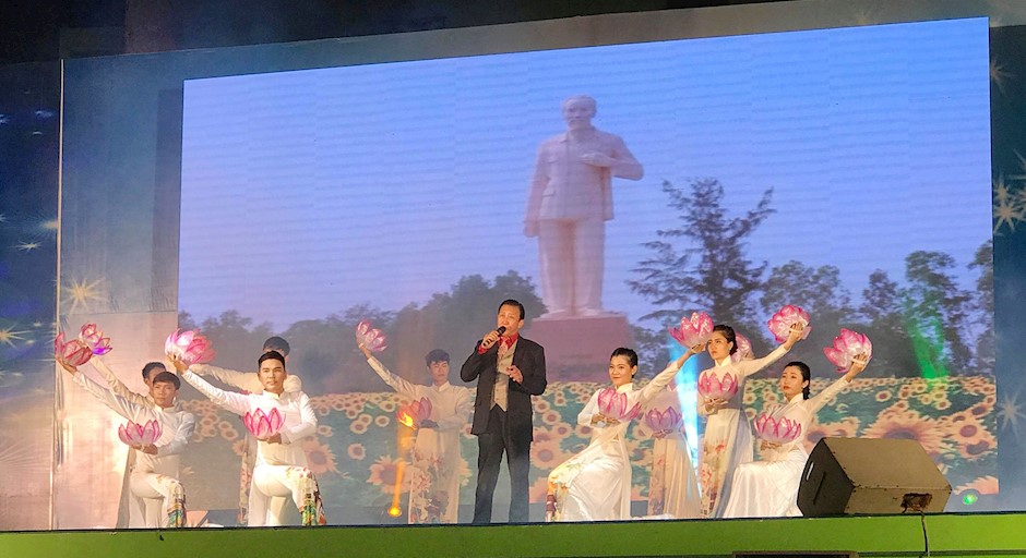 NSƯT Thế Hiển thể hiện ca khúc Nguyện theo bước chân Người do mình sáng tác trong chương trình nghệ thuật “Kể chuyện mùa xuân”. (Ảnh: Hội Âm nhạc TPHCM)(Thanhuytphcm.vn) - Hòa trong không khí chào mừng kỷ niệm 50 năm cuộc Tổng tiến công và nổi dậy Xuân Mậu Thân 1968, tối 31/1, tại Công viên Văn Lang (Quận 5), Trung tâm Tổ chức biểu diễn - Hội Âm nhạc TPHCM kết hợp với Trung tâm Văn hoá Quận 5 tổ chức chương trình nghệ thuật “Kể chuyện mùa Xuân”.