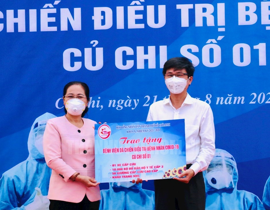 Dịp này, HĐND TP trao tặng 1 xe cấp cứu, 10.000 bộ đồ bảo hộ y tế cấp độ 3; 50 giường cấp cứu cao cấp và khẩu trang N95 cho bệnh viện dã chiến điều trị bệnh nhân Covid -19 Củ Chi số 1.