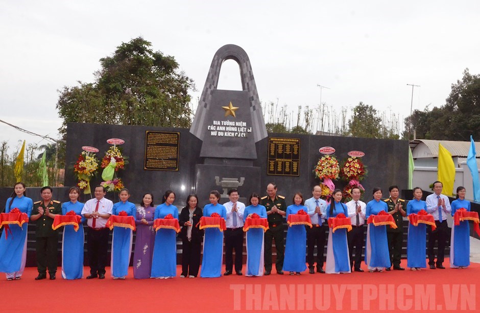 Các đại biểu cắt băng khánh thành Bia tưởng niệm các anh hùng liệt sĩ nữ du kích Củ Chi(Thanhuytphcm.vn) - Kỷ niệm 55 năm thành lập Đội nữ du kích Củ Chi (10/11/1965 - 10/11/2020), chiều 10/11, Khu di tích lịch sử địa đạo Củ Chi đã tổ chức Lễ khánh thành công trình Bia tưởng niệm các anh hùng liệt sĩ nữ du kích Củ Chi. Đến dự có các đồng chí: Nguyễn Thành Phong, Ủy viên Trung ương Đảng, Phó Bí thư Thành ủy, Chủ tịch UBND TP; Nguyễn Thị Lệ, Phó Bí thư Thành ủy, Chủ tịch HĐND TP; Thiếu tướng Nguyễn Văn Nam, Ủy viên Ban Thường vụ Thành ủy, Tư lệnh Bộ Tư lệnh TP. Cùng dự có các đồng chí Thành ủy viên: Thiếu tướng Phan Văn Xựng, Chính ủy Bộ Tư lệnh TP; Trần Thế Thuận, Giám đốc Sở Văn hóa – Thể thao TP; Lê Minh Tấn, Giám đốc Sở Lao động – Thương binh và Xã hội TP; Lê Văn Minh, Phó Trưởng Ban Thường trực Ban Tuyên giáo Thành ủy TPHCM; Nguyễn Quyết Thắng, Bí thư Huyện ủy huyện Củ Chi…