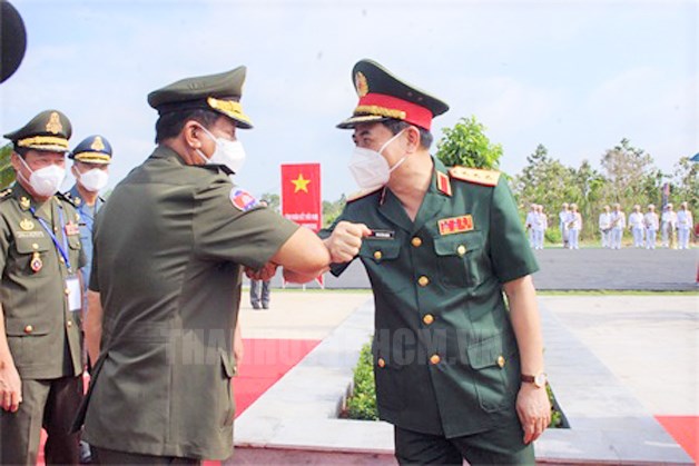 Thượng tướng Phan Văn Giang, Ủy viên Bộ Chính trị, Bộ trưởng Bộ Quốc phòng Việt Nam chào mừng Đại tướng Tea Banh sang dự lễ.(Thanhuytphcm.vn) - Nhân kỷ niệm 44 năm sự kiện Thủ tướng Campuchia Hun Sen cùng đồng đội sang Việt Nam tìm “Con đường tiến tới đánh đổ chế độ diệt chủng Pol Pot” (20/6/1977 – 20/6/2021), ngày 20/6, tỉnh Bình Phước tổ chức khánh thành Cụm công trình lưu niệm hành trình cứu nước của Thủ tướng Campuchia Hun Sen tại khu vực X16, xã Lộc Tấn, huyện Lộc Ninh, tỉnh Bình Phước.