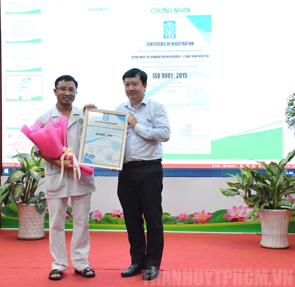 Ông Lê Trung Phương trao Chứng nhận ISO 9001:2015 cho đại diện Khoa Khám bệnh theo yêu cầu(Thanhuytphcm.vn) - Sáng 9/11, Bệnh viện Lê Văn Thịnh tổ chức lễ công bố các khoa lâm sàng, cận lâm sàng đạt chuẩn ISO về chất lượng năm 2023. Tham dự có ông Lê Trung Phương, đại diện Tổ chức chứng nhận đa Quốc gia TNV; bà Nguyễn Thị Lan Anh, Giám đốc văn phòng phía Nam - Văn phòng công nhận năng lực đánh giá sự phù hợp về tiêu chuẩn chất lượng (AOSC); BS.CKII Trần Văn Khanh, Giám đốc Bệnh viện Lê Văn Thịnh…