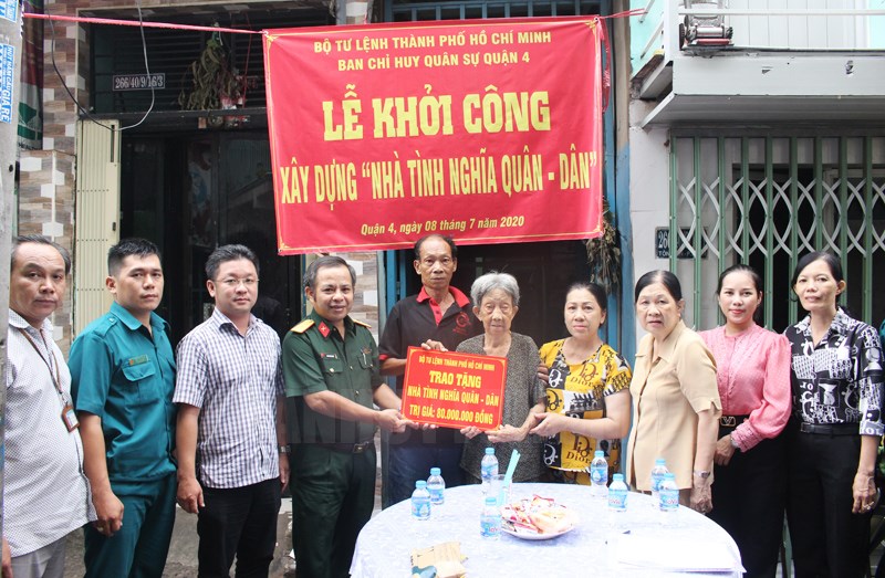 Trung tá Cao Thanh Hải trao kinh phí xây dựng “Nhà tình nghĩa quân – dân”.(Thanhuytphcm.vn) - Chiều 8/7, tại Phường 8, Quận 4, Bộ Tư lệnh TPHCM tổ chức khởi công xây dựng “Nhà tình nghĩa quân – dân” năm 2020 cho đối tượng chính sách trên địa bàn. Tham dự có các đồng chí: Trung tá Cao Thanh Hải, Phó Chỉ huy trưởng Ban CHQS Quận 4; Huỳnh Tuấn Tú, Bí thư Đảng ủy Phường 8; Nguyễn Thị Kim Ngọc, Chủ tịch Ủy ban MTTQ Việt Nam Phường 8…