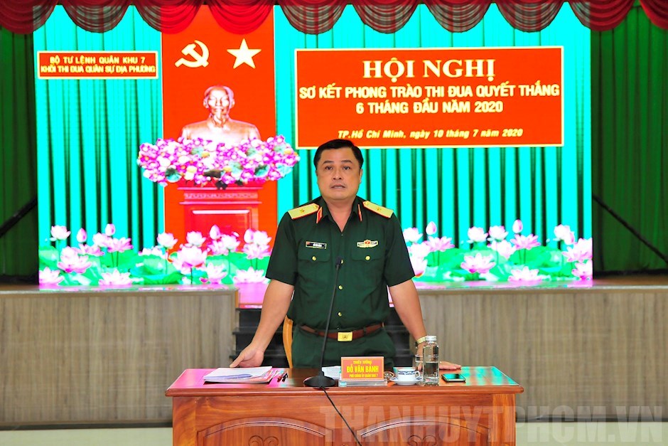 Thiếu tướng Đỗ Văn Bảnh, Phó Chính ủy Quân khu phát biểu tại hội nghị(Thanhuytphcm.vn) - Chiều 10/7, Khối thi đua Quân sự địa phương Quân khu 7, gồm: Bộ Tư lệnh TPHCM và Bộ Chỉ huy Quân sự 8 tỉnh trên địa bàn Quân khu 7 đã tổ chức hội nghị sơ kết công tác thi đua, khen thưởng và phong trào thi đua quyết thắng 6 tháng đầu năm 2020. Đến dự có Thiếu tướng Đỗ Văn Bảnh, Phó Chính ủy Quân khu 7; Thiếu tướng Nguyễn Văn Hoàng, Phó Tham mưu trưởng Quân khu; Đại tá Thái Thành Đức, Phó Chủ nhiệm Chính trị Quân khu 7 và lãnh đạo, chỉ huy 8 tỉnh, Thành phố.