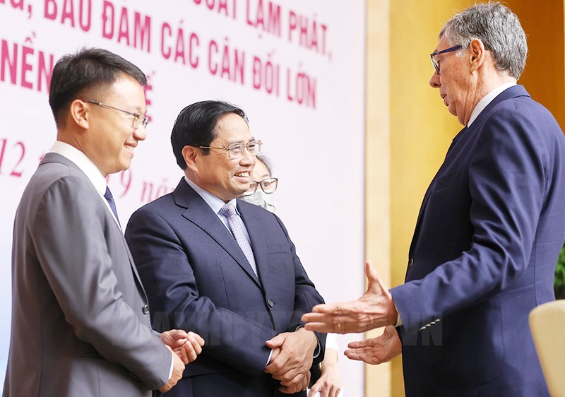 Thủ tướng trao đổi với các đại biểu dự hội nghị.(Thanhuytphcm.vn) - Chiều 12/9, Thủ tướng Phạm Minh Chính, Phó Thủ tướng Lê Minh Khái chủ trì hội nghị về giữ vững ổn định kinh tế vĩ mô, kiểm soát lạm phát, thúc đẩy tăng trưởng và đảm bảo các cân đối lớn của nền kinh tế. Dự hội nghị có lãnh đạo các bộ ngành, các chuyên gia kinh tế, nhà khoa học trong nước, cùng đại diện nhiều tổ chức quốc tế.