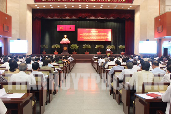 Bí thư Thành ủy TPHCM Đinh La Thăng trao đổi với các đại biểu tại hội nghị. Ảnh: S. Hải |