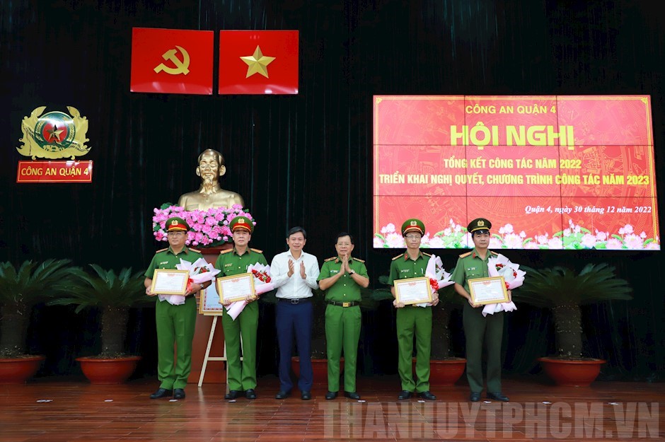 Thiếu tướng Trần Đức Tài (thứ 3 từ phải) và đồng chí Lê Văn Chiến, (thứ 3 từ trái) trao Bằng khen “Đơn vị Quyết thắng” đến các tập thể(Thanhuytphcm.vn) - Ngày 30/12, Công an Quận 4 tổ chức hội nghị tổng kết công tác năm 2022 và triển khai công tác năm 2023. Dự hội nghị có các đồng chí: Thiếu tướng Trần Đức Tài, Phó Giám đốc Công an TPHCM; Nguyễn Quốc Thái, Bí thư Quận ủy; Lê Văn Chiến, Chủ tịch UBND Quận 4.