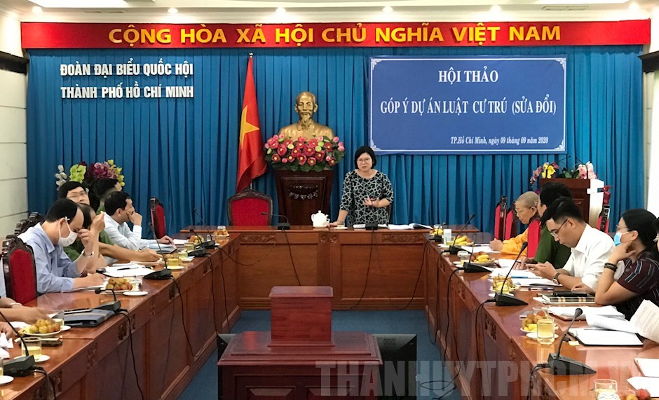 Quang cảnh hội thảo góp ý dự án Luật Cư trú (sửa đổi)(Thanhuytphcm.vn) - Sáng 9/9, Đoàn Đại biểu Quốc hội (ĐBQH) TPHCM tổ chức hội thảo góp ý dự án Luật Cư trú (sửa đổi). Thành ủy viên, Phó Trưởng đoàn ĐBQH TPHCM Văn Thị Bạch Tuyết chủ trì hội thảo.