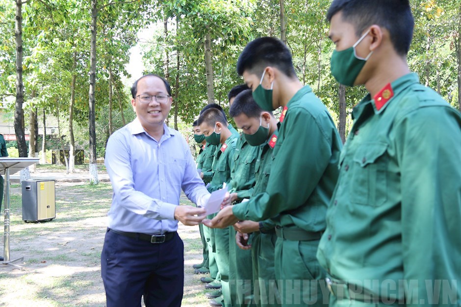 Phó Bí thư Huyện ủy, Chủ tịch UBND huyện Hóc Môn Dương Hồng Thắng động viên các chiến sĩ mới hãy cố gắng học tập, rèn luyện, xứng đáng là người con của quê hương Hóc Môn - Bà Điểm anh hùng. Đồng chí cảm ơn đơn vị đã tiếp nhận, huấn luyện chiến sĩ mới của huyện Hóc Môn.