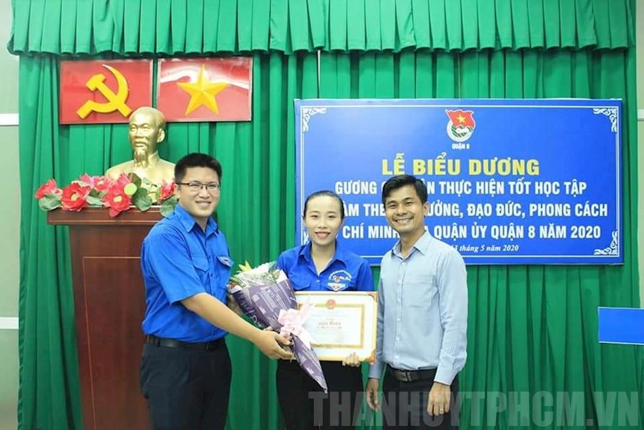 Lê Thị Ngọc Anh (đứng giữa) được tuyên dương gương điển hình học tập và làm theo Bác cấp Quận năm 2020(Thanhuytphcm.vn) - Vóc dáng nhanh nhẹn, hoạt bát, nhiệt huyết với hoạt động phong trào đoàn, gần gũi chia sẻ với bà con nghèo, quan tâm giúp đỡ các em thiếu nhi có hoàn cảnh khó khăn, giàu nghị lực, biết vượt lên hoàn cảnh để làm việc và cống hiến… Đó là lời nhận xét của nhiều người khi nhắc đến Lê Thị Ngọc Anh (sinh năm 1991), gương điển hình học tập và làm theo tư tưởng, đạo đức, phong cách Hồ Chí Minh năm 2020, hiện là Uỷ viên Ban Thường vụ Quận đoàn Quận 8, nguyên Bí thư Đoàn Phường 8.