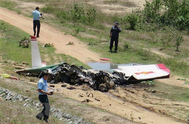 Một phần xác máy bay rơi, có dấu hiệu bị cháy. (Ảnh: TTXVN)Sáng 16/6, tại Nhà tang lễ Bệnh viên Đa khoa tỉnh Khánh Hòa, thành phố Nha Trang, Bộ Tư lệnh Quân chủng Phòng không-Không quân, Trường Sĩ quan Không quân và gia đình đã tổ chức lễ viếng và truy điệu Thiếu tá Lê Xuân Trường và Thiếu úy Đào Văn Long, đã hy sinh trong khi làm nhiệm vụ huấn luyện bay.