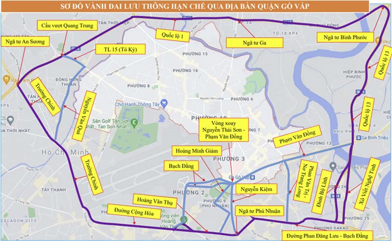 Sơ đồ vành đai lưu thông hạn chế qua địa bàn quận Gò Vấp.(Thanhuytphcm.vn) – Nhằm hạn chế tình trạng ùn tắc các loại phương tiện giao thông kéo dài, đặc biệt một lượng lớn xe 02 bánh tập trung tại các chốt kiểm soát trên 15 tuyến đường chính dọc theo địa bàn quận Gò Vấp trong 02 ngày vừa qua, Sở Giao thông vận tải (GTVT) TP đã ban hành Công văn số 5590/SGTVT-KT gửi UBND quận Gò Vấp, Trung tâm Quản lý điều hành giao thông đô thị; Trung tâm quản lý hạ tầng giao thông đường bộ; Thanh tra Sở GTVT và Trung tâm Báo chí TP.