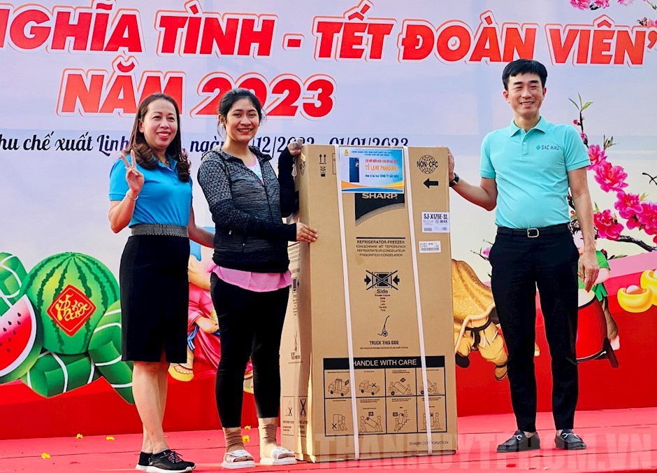 Tặng quà cho công nhân tại chương trình “Tết sum vầy”Không kìm được xúc động, Kiều cho biết: “Dù quê Sóc Trăng nhưng Tết này quyết định ở lại không về. Với chiếc tủ lạnh này, món quà giá trị nhất mà em được nhận từ trước đến nay. Vậy là hai vợ chồng có thể dự trữ 1 ít thức ăn để dùng trong những ngày Tết. Về lâu về dài có điều kiện để chủ động nguồn thực phẩm, trữ sữa khi sinh con”. Kiều đang mang thai đứa con thứ hai gần 5 tháng. Do công ty thời gian qua ít đơn hàng nên chỉ làm luân phiên, không tăng ca, thu nhập có phần nào giảm sút. Khi được Công đoàn KCX-CN TP lựa chọn là 1 trong 30.000 công nhân khó khăn chăm lo Tết, Kiều cảm thấy rất ấm lòng. Mong muốn năm mới này công ty sẽ có thêm nhiều đơn hàng để ổn định thu nhập và có điều kiện nuôi con.