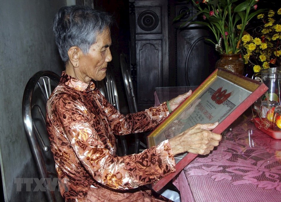 Mẹ Lương Thị Cưng với tấm bằng Tổ quốc ghi công của người thân. (Ảnh : TTXVN)Ba lần tiễn chồng, con, cháu lên đường đánh giặc là từng ấy lần Mẹ Việt Nam Anh hùng Lương Thị Cưng, 85 tuổi, ở ấp Lương Văn Hoàng, xã Ngọc Tố, huyện Mỹ Xuyên, tỉnh Sóc Trăng không gặp lại người thân của mình.