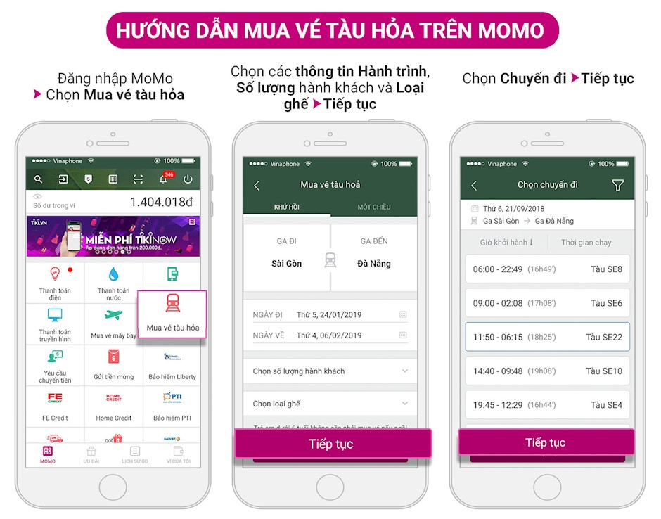 Theo đó, từ thời gian trên, khách hàng chỉ cần đăng nhập ví Momo, chọn “Mua vé tàu hỏa” để mua vé tàu khởi hành trong khoảng thời gian 23/1 - 22/2/2019 ở tất cả các tuyến. Dự kiến, trong thời gian phục vụ hành khách Tết Kỷ Hợi (23/1 đến 22/2/2019), VNR tổ chức chạy 25 đôi tàu trên tuyến đường sắt Bắc – Nam (tăng 15 đôi tàu/ngày so với ngày thường). VNR cũng bố trí 3 đôi tàu Thống Nhất (Hà Nội - Sài Gòn) và 2 đôi tàu khách khu đoạn (Quảng Ngãi - Sài Gòn, Đà Nẵng - Sài Gòn) sẽ chạy xuyên suốt trong cả dịp nghỉ Tết. Tổng vé tàu Bắc - Nam phục vụ khách hàng trong dịp Tết Nguyên đán đáp ứng khoảng 14.000 chỗ/ngày.