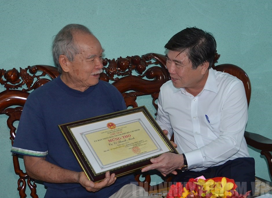 Chủ tịch UBND TP Nguyễn Thành Phong tặng Giấy Mừng thọ cho cụ Võ Thanh Minh(Thanhuytphcm.vn) - Nhân kỷ niệm Ngày truyền thống Người cao tuổi Việt Nam (ngày 6/6), chiều 4/6, đoàn cán bộ TPHCM do đồng chí Nguyễn Thành Phong, Ủy viên Trung ương Đảng, Phó Bí thư Thành ủy, Chủ tịch UBND TPHCM làm trưởng đoàn đã đến thăm, chúc thọ các cụ cao tuổi tiêu biểu tại Quận 1.