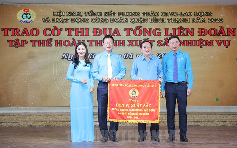 Đồng chí Phùng Thái Quan trao Cờ thi đua của Tổng LĐLĐ Việt Nam cho tập thể LĐLĐ quận Bình Thạnh.(Thanhuytphcm.vn) - Sáng 03/01/2024, Liên đoàn Lao động (LĐLĐ) quận Bình Thạnh đã tổ chức Hội nghị tổng kết phong trào công nhân, viên chức, người lao động (CNVC-LĐ) và hoạt động công đoàn năm 2023. Đến tham dự hội nghị có các đồng chí: Phùng Thái Quang - Phó Chủ tịch LĐLĐ TPHCM; Nguyễn Thành Đô, Trưởng ban Chính sách – Pháp luật LĐLĐ TP; Triệu Lệ Khánh, Phó Bí thư Thường trực Quận ủy; Nguyễn Văn Cảnh, Trưởng Ban Dân vận Quận ủy; Thái Thị Hồng Nga, Phó Chủ tịch Ủy ban Nhân dân quận; Nguyễn Thu Hương, Chủ tịch Ủy ban Mặt trận Tổ quốc Việt Nam quận; Cao Hồng Hà, Quận ủy viên, Chủ tịch LĐLĐ quận Bình Thạnh.