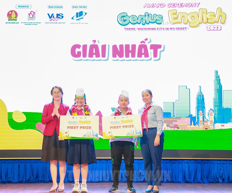 Ban Tổ chức trao giải nhất cho hai thí sinh xuất sắc cuộc thi(Thanhuytphcm.vn) - Ngày 27/8, Cuộc thi Tài năng Anh ngữ lần 2 năm 2023 với chủ đề: “Em yêu thành phố của em” do Trung tâm Phát triển Khoa học và Công nghệ Trẻ phối hợp cùng Hội đồng Đội TPHCM tổ chức vừa diễn ra vòng thi chung kết và trao giải.