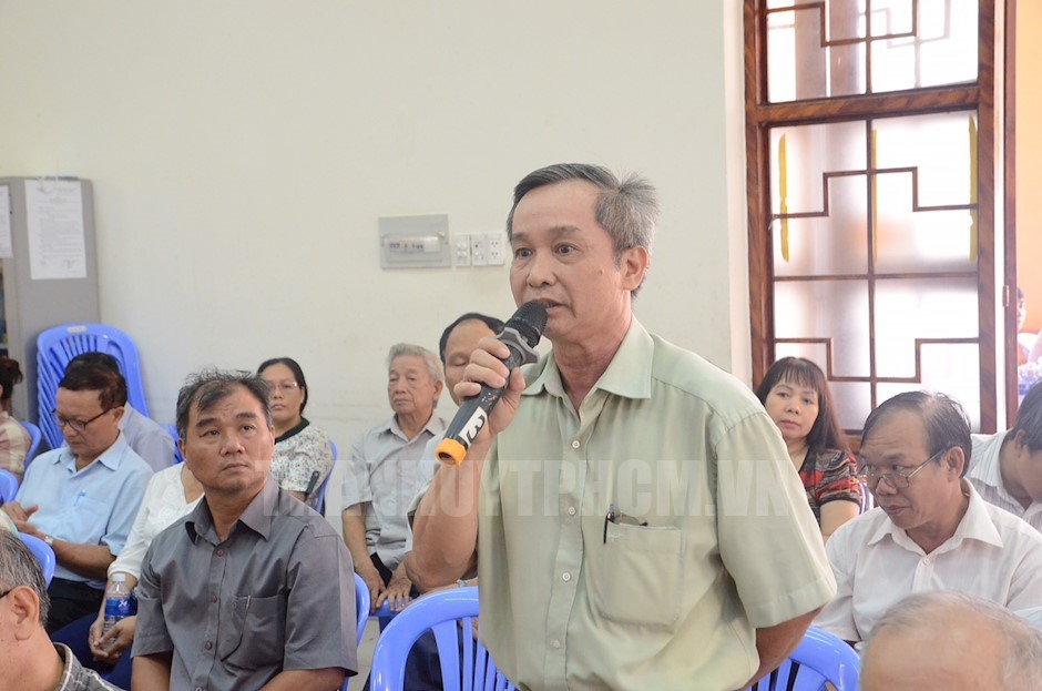 Cử tri quận Tân Bình phát biểu tại buổi tiếp xúc(Thanhuytphcm.vn) - Sáng 25/11, Tổ đại biểu Quốc hội (ĐBQH) đơn vị 5 – TPHCM gồm các đại biểu (ĐB): Chủ tịch Liên đoàn Lao động TP Trần Kim Yến; Chủ tịch Hội Cựu chiến binh TP Nguyễn Văn Chương và Phó Chủ tịch Hội Luật gia TPHCM Nguyễn Đức Sáu đã có buổi tiếp xúc cử tri quận Tân Bình sau kỳ họp thứ 4 QH khoá XIV.