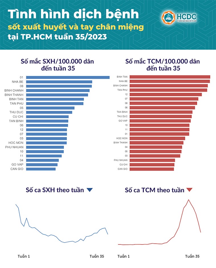 Tình hình bệnh SXH và TCM tại TP trong tuần.(Thanhuytphcm.vn) - Thông tin từ Trung tâm Kiểm soát bệnh tật TPHCM (HCDC) cho biết, trong tuần 35 qua (từ ngày 28/8 đến ngày 3/9/2023), TP ghi nhận 792 ca tay chân miệng (TCM), giảm 20,6% so với tuần trước và giảm 60,5% so với trung bình 4 tuần trước. Như vậy TCM đã giảm 5 tuần liên tiếp từ đầu tháng 8/2023.