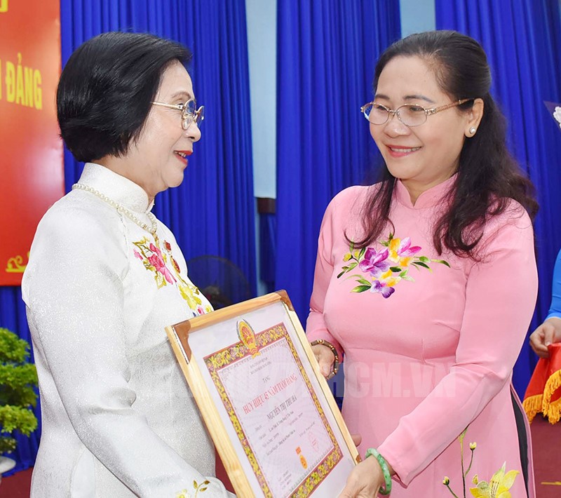 Đồng chí Nguyễn Thị Lệ và đồng chí Nguyễn Quyết Thắng trao Huy hiệu Đảng cho các đảng viên. Thay mặt các đảng viên nhận Huy hiệu Đảng đợt này, đồng chí Nguyễn Thị Thu Hà, nguyên Phó Bí thư Thành ủy TPHCM, bày tỏ niềm vinh dự được nhận Huy hiệu 45 năm tuổi Đảng. “Tôi cảm thấy thật xúc động vì đã được Đảng rèn luyện bản lĩnh chính trị vững vàng, để từ đó ngày càng kiên định, sắt son, một lòng tin vào sự lãnh đạo của Đảng, luôn giữ vững phẩm chất của một người cộng sản, luôn hoàn thành tốt những nhiệm vụ được Đảng giao cho” - đồng chí Nguyễn Thị Thu Hà nhấn mạnh.
