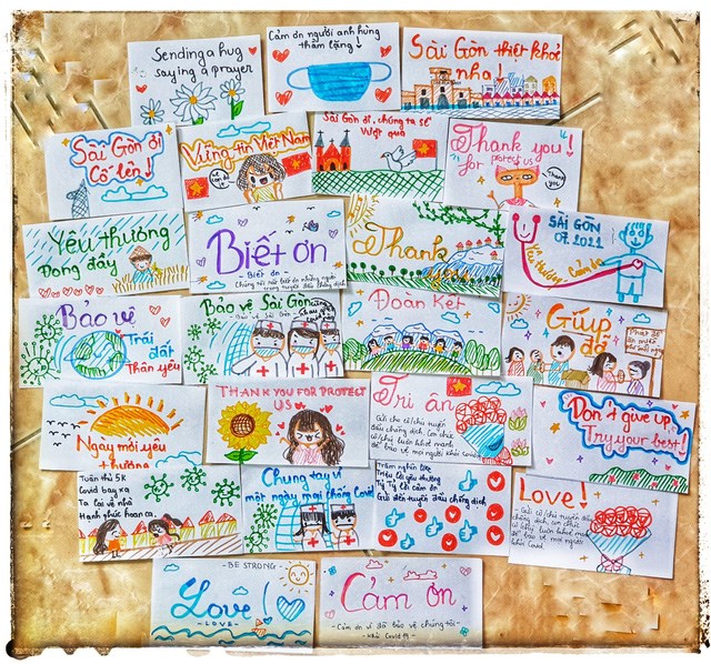 Đó là những dòng nhắn nhủ được viết và vẽ bằng tay của các học sinh, phụ huynh Bếp tuyến đầu hệ thống Trường Tuệ Đức - Pathway school, dành cho các y bác sĩ, điều dưỡng đang tham gia chống dịch Covid-19 ở TPHCM. Những dòng thông điệp yêu thương này đã góp phần sưởi ấm trái tim của những chiến sĩ tuyến đầu đang căng mình chống dịch.