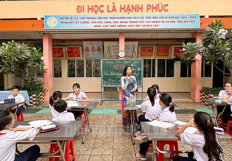 Cô Võ Thị Trúc Mai chia sẻ cùng học sinh tại Hội thi “Em viết đúng - Viết đẹp”(Thanhuytphcm.vn) - Hơn 36 năm cống hiến cho sự nghiệp "trồng người”, Nhà giáo Ưu tú Võ Thị Trúc Mai, Bí thư Chi bộ, Hiệu trưởng Trường Tiểu học Trần Nguyên Hãn, Phường 13, Quận 8 - là một nhà giáo, một cán bộ quản lý tận tâm với nghề; không ngừng nỗ lực phấn đấu và dành trọn tâm huyết cho sự nghiệp ngành giáo dụ, là minh chứng cho sự nghiệt tình và tâm huyết "tất cả vì học sinh thân yêu”...
