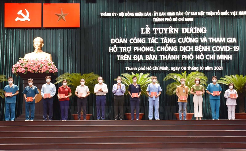 Bí thư Thành ủy TPHCM Nguyễn Văn Nên và Phó Bí thư Thường trực Thành ủy, Chủ tịch UBND TP Phan Văn Mãi trao Huy hiệu TPHCM cho các cá nhân tăng cường, tham gia hỗ trợ công tác phòng chống dịch bệnh tại TPHCM. (Ảnh: Đan Như)(Thanhuytphcm.vn) - Hơn 100 ngày, lực lượng chi viện với gần 30.000 các chiến sĩ tình nguyện từ các bộ, ngành Trung ương và các tỉnh, thành đã cùng sát cánh với quân dân TPHCM - nơi tuyến đấu chống dịch Covid-19, để TP có được bước chuyển quan trọng trong kiểm soát dịch bệnh. Giờ thì các đơn vị của lực lượng chi viện rút dần theo lộ trình. Lãnh đạo TPHCM đã thay mặt Đảng bộ và người dân nói lời tri ân và tuyên dương các đơn vị, cá nhân xuất sắc, góp phần đắc lực làm nên kết quả đáng trân trọng ấy. Từ trong sâu thẳm, người Sài Gòn – TPHCM sẽ không thể nào quên những con người quả cảm, bất chấp hiểm nguy, làm việc quên mình vì sức khỏe và cuộc sống bình yên cho người dân TP này.