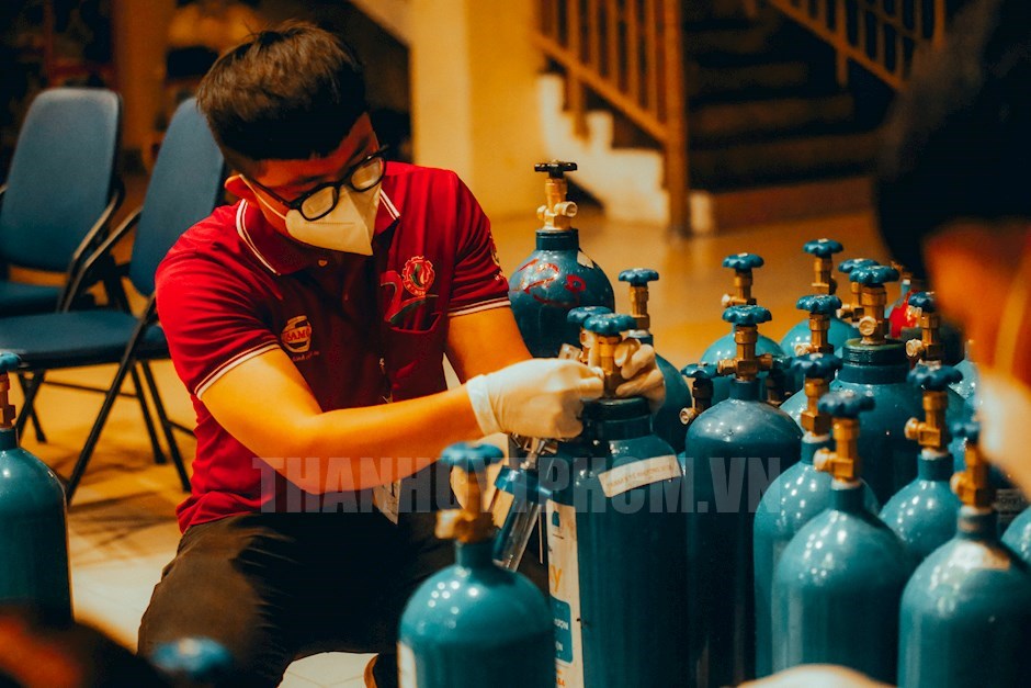 Tại Nhà Thiếu nhi Quận 4, hàng trăm bình oxy liên tục được bơm đầy để sẵn sàng tiếp nối sự sống cho những bệnh nhân khi cần. Trong bộ đồ bảo hộ nóng nực, các thành viên đội vừa kiểm tra bình, vừa hỗ trợ vận chuyển bình đi bơm, vừa trực sẵn sàng lên đường hỗ trợ bệnh nhân.
