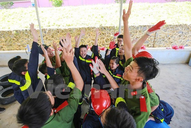 Các em học sinh tại trại hè lính cứu hỏa trong dịp hè.(Ảnh: Vietnam+)